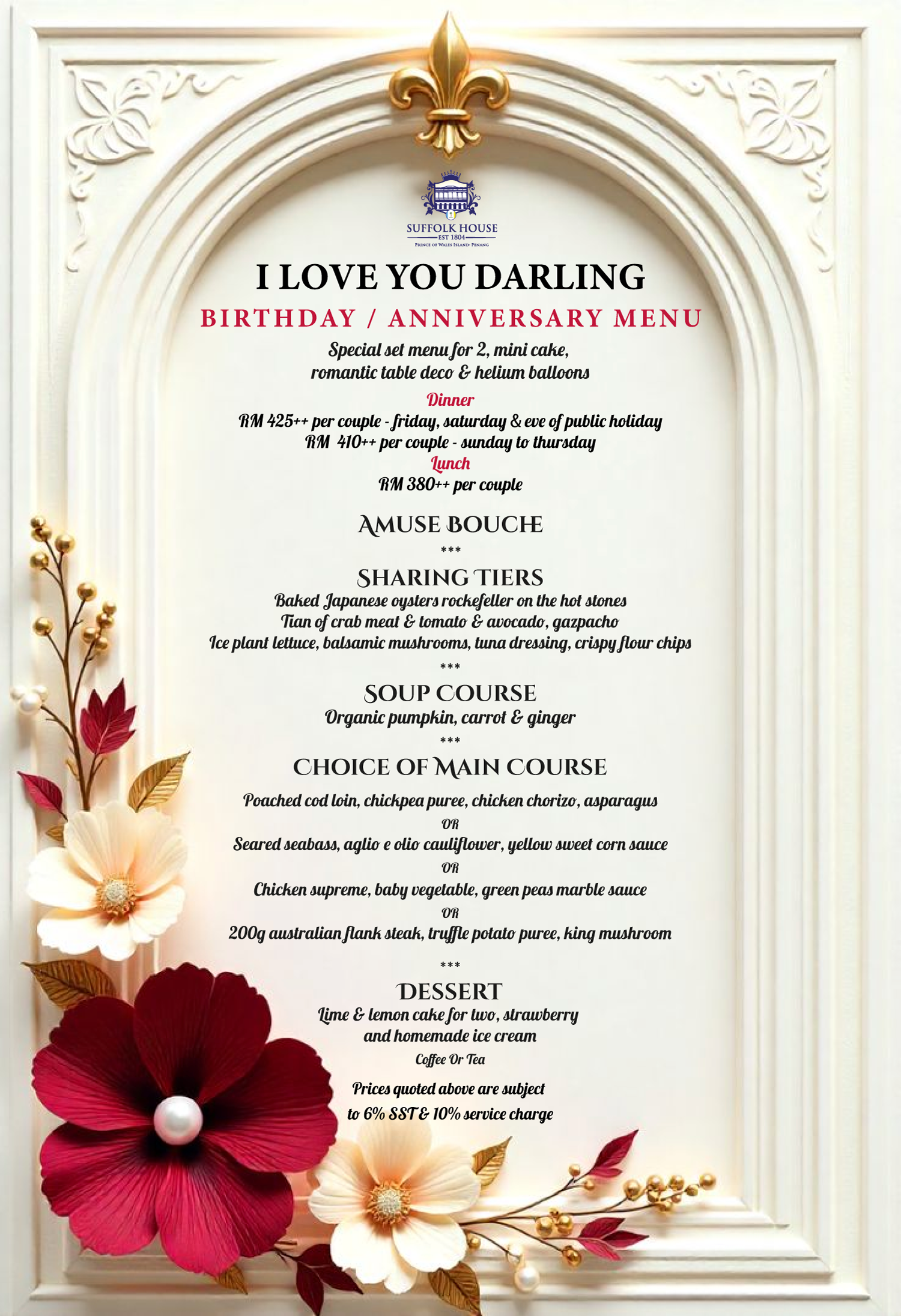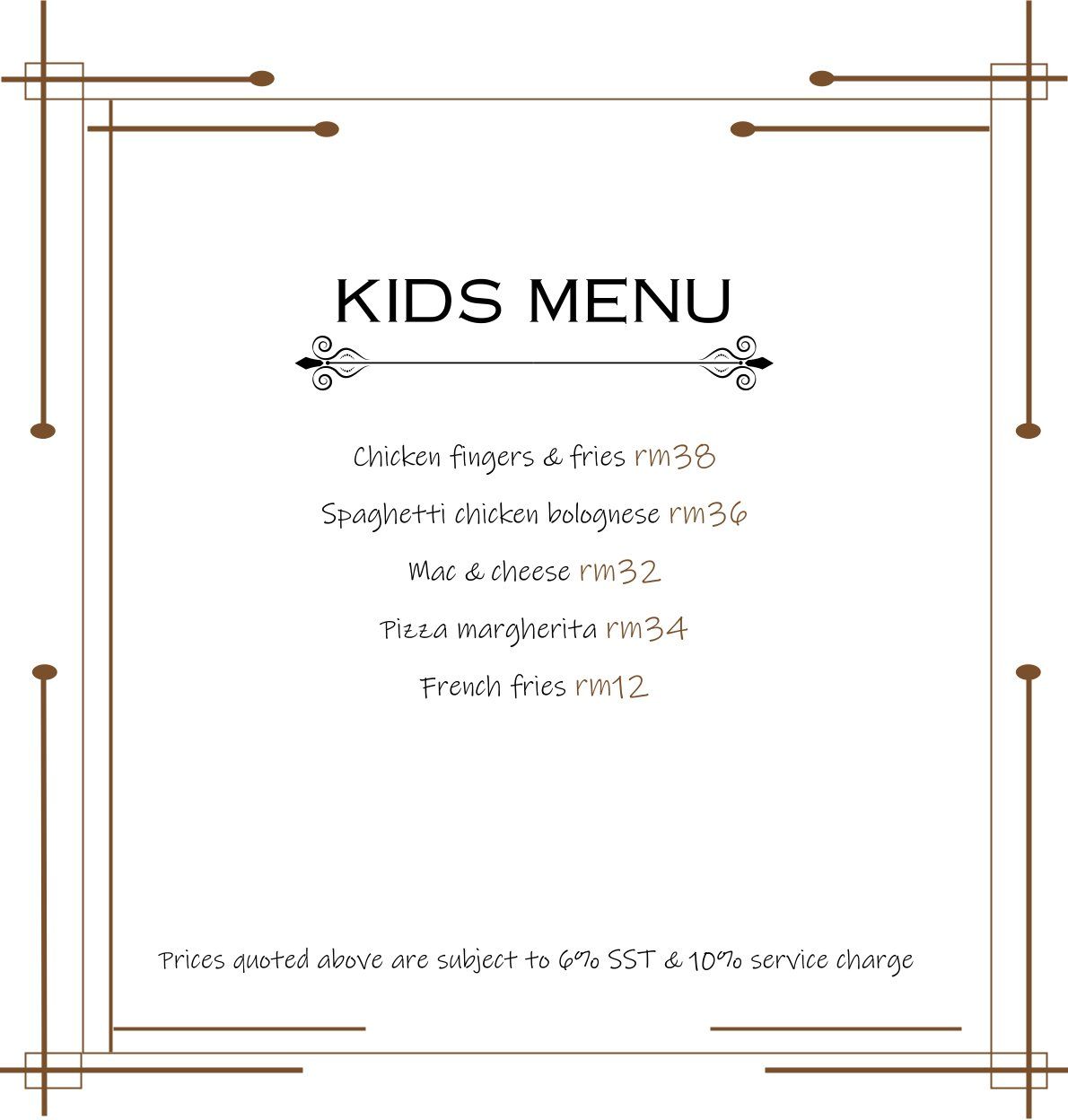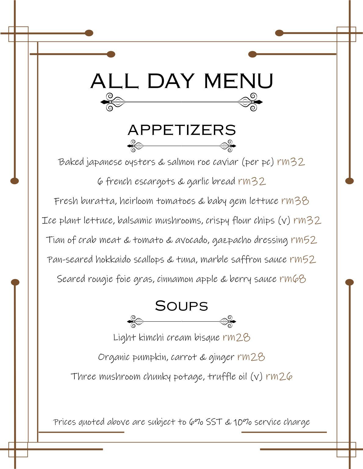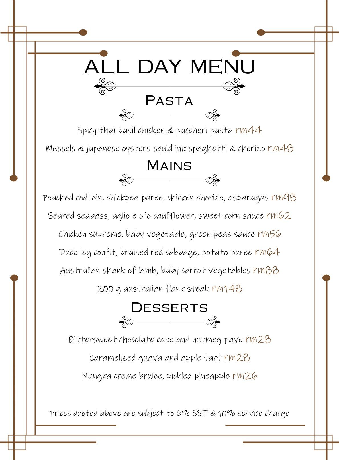 PRICES ARE SUBJECT TO 10% SERVICE CHARGE AND 6% SALES AND SERVICE TAX UNLESS OTHERWISE STATED